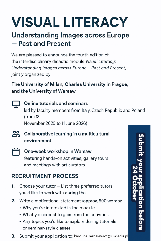Od października 2021 do czerwca 2022 Instytut Historii Sztuki UW realizował – w ramach sojuszu 4EU+ – wspólnie z Uniwersytetem Karola w Pradze i Uniwersytetem Mediolańskim roczny, międzynarodowy moduł edukacyjny pt. Visual Literacy: Understanding Images across Europe – Past and Present.
